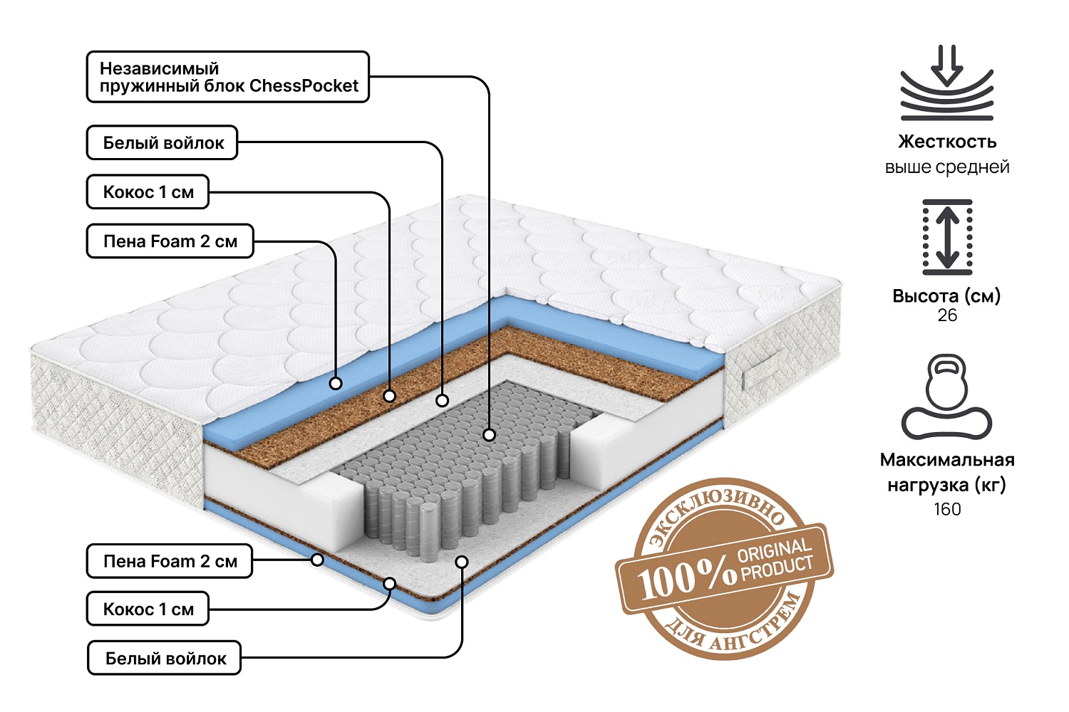 Благодаря блоку независимых пружин ChessPoket, расположенных в шахматном порядке, обеспечивается оптимальная поддержка позвоночника во время сна. Матрас помогает снять нагрузку со спины и поддерживает область поясницы. Каждая пружина работает отдельно от остальных, обеспечивая точечную поддержку тела и минимизируя передачу движений. Кокосовая койра придает оптимальную жесткость, а современный гипоаллергенный материал Foam дарит комфорт. Чехол выполнен из высококачественного трикотажа, простеганного на объемном гипоаллергенном синтепоне.